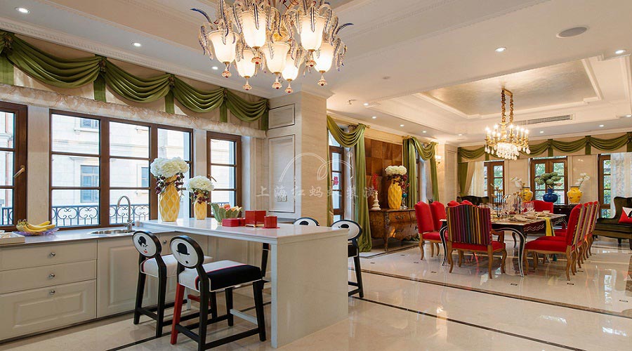 秉持典型的法式風(fēng)格搭配原則,餐桌和餐椅均為米白色,表面略帶雕花,配合扶手和椅腿的弧形曲度,顯得優(yōu)雅矜貴,而在白色的卷草紋窗簾、水晶吊燈、落地?zé)簟⑵坎灏俸匣ǖ拇钆湎拢寺逍轮袚涿娑鴣?lái)。